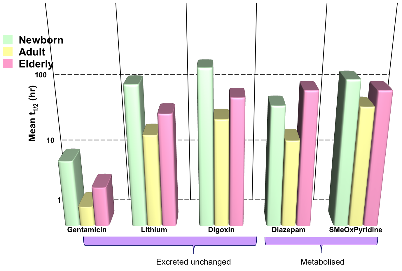- Drug elimination is less efficient in newborn babies and old people (elimination t1/2 longer)