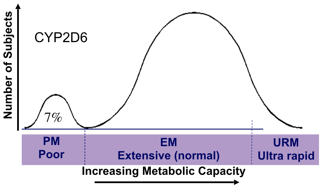 - CYP2D6 PM 5-10% of Caucasians,1–3% Asians
