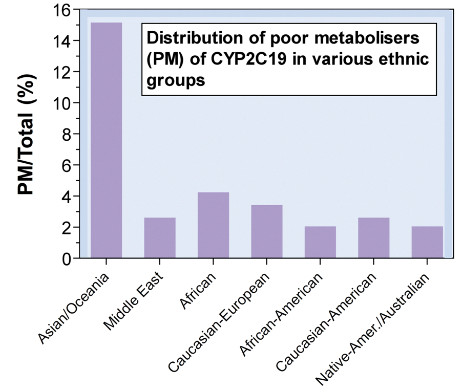 CYP2C19 PM in 15% of Asians, 3–5% Caucasians (Clin Pharmacokinet, 2002: 41(12): 913-958)